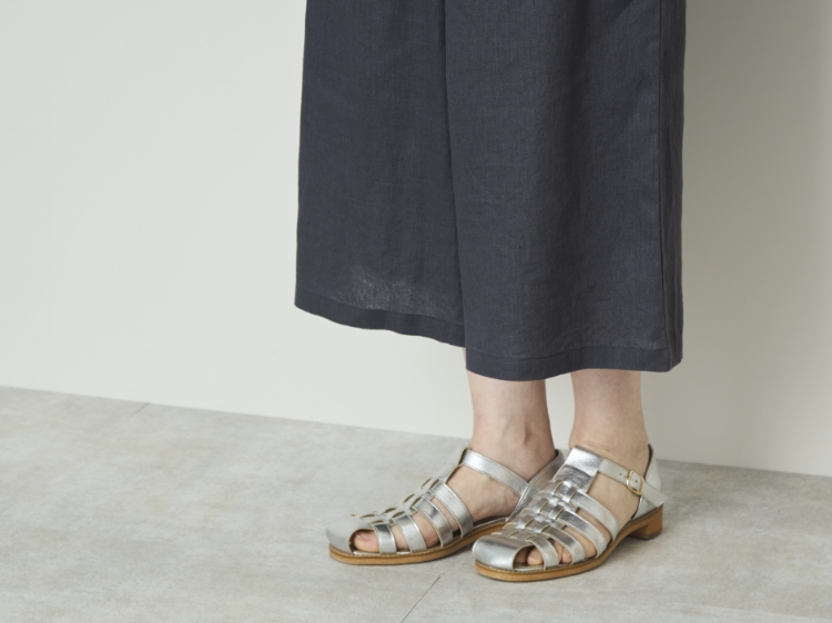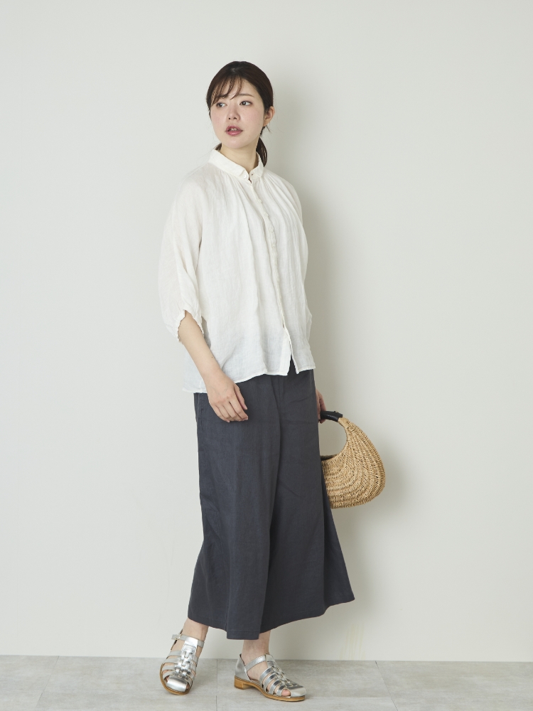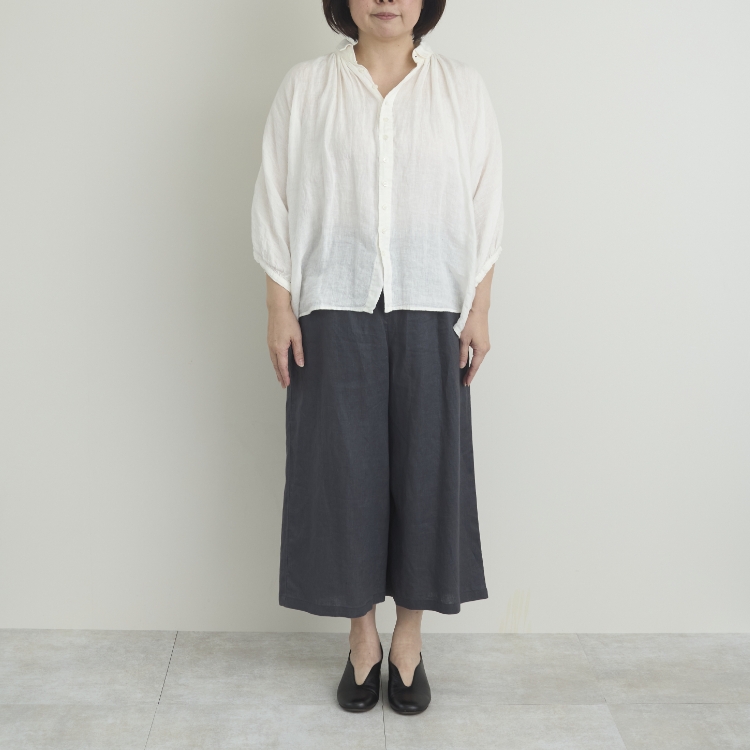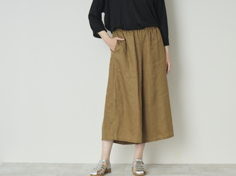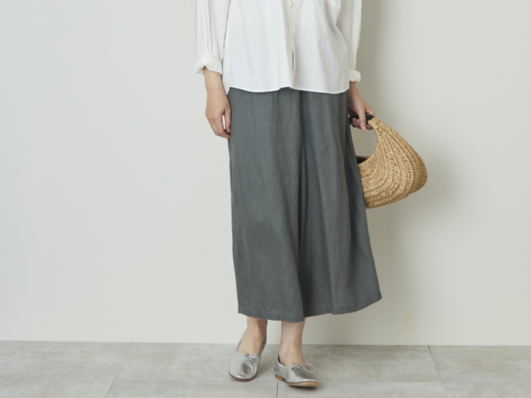 ゆったりとしたワイド型のパンツは、とろみのある生地が揺れて、美しいシルエットを作ります。8分丈が特徴ですが、その理由を聞いたところ、裾から風が通りやすいのは何分丈なのかをいろいろ試したのだそう。その結果、8分丈が一番涼しかったのだそうです。