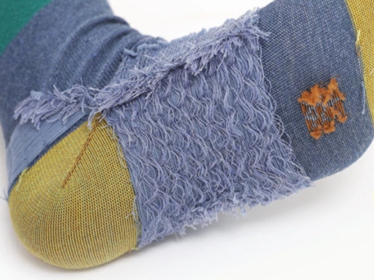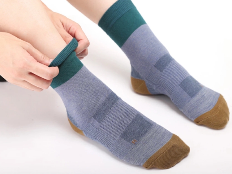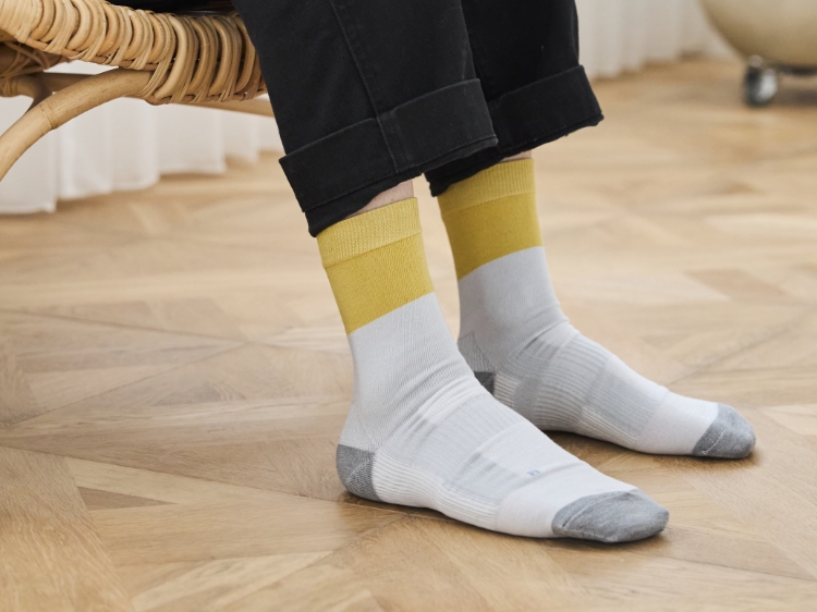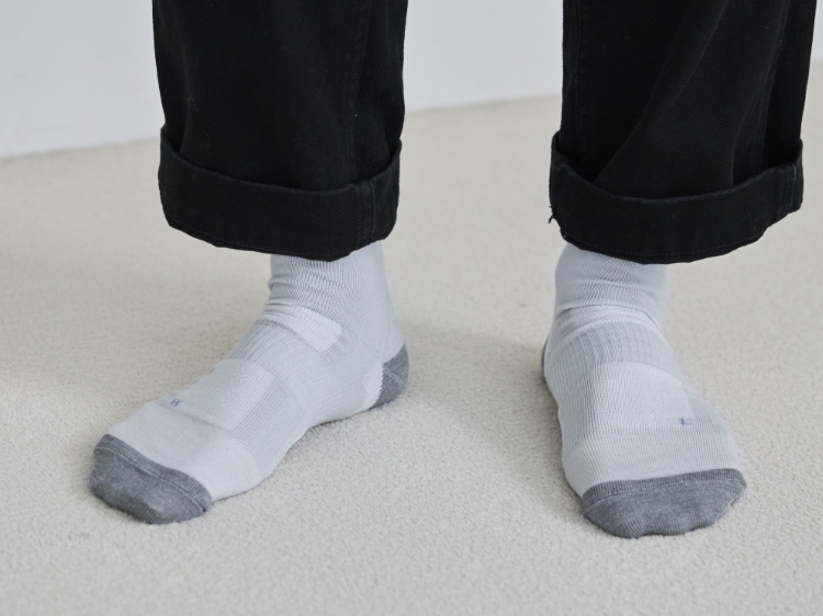 次に、衝撃を吸収する「クッション編み」が、地面から伝わる衝撃を受け止めます。一般的な靴下とは異なる特殊な編み組織によって、生地の中に厚みと弾力のある層を作り出しています。これが「第2のクッション」として機能し、歩行時の強い衝撃を吸収。