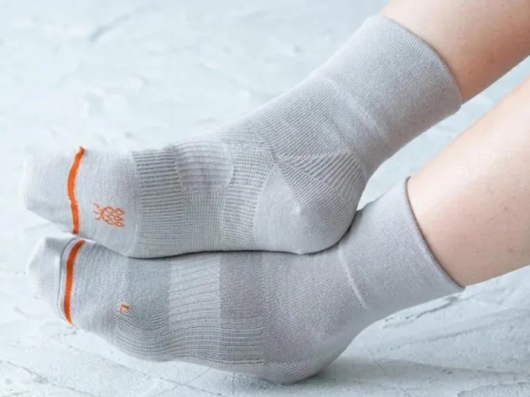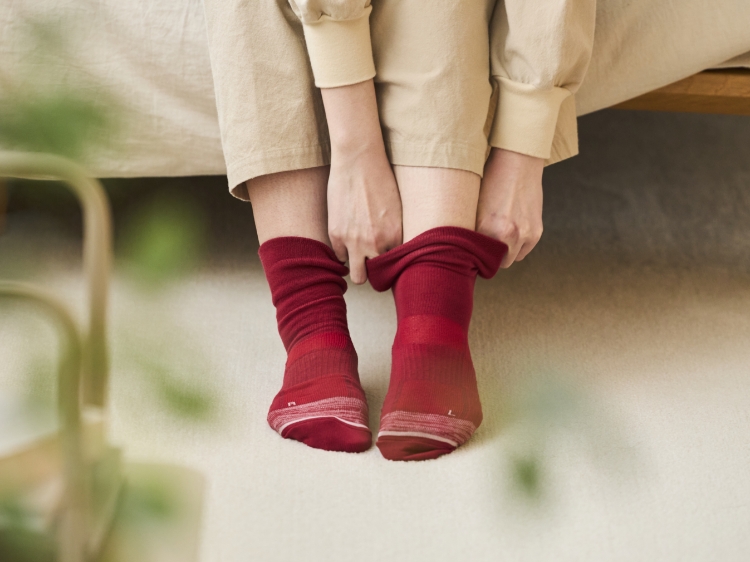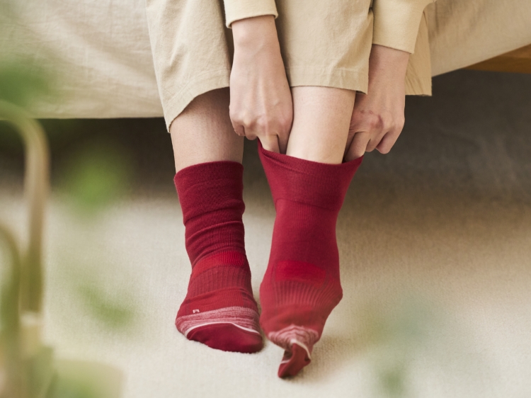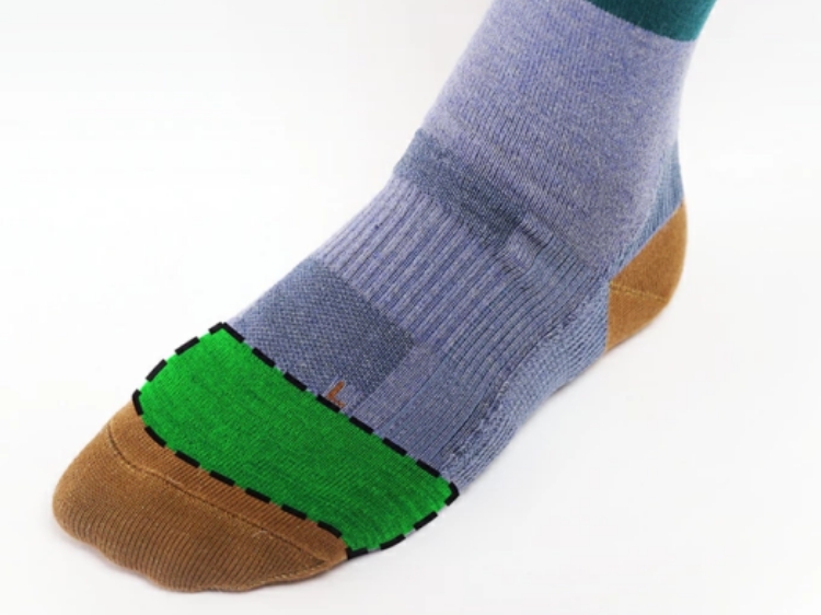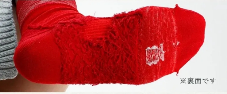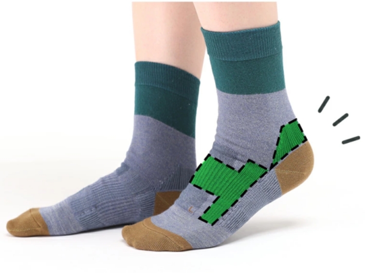 次に、衝撃を吸収する「クッション編み」が、地面から伝わる衝撃を受け止めます。一般的な靴下とは異なる特殊な編み組織によって、生地の中に厚みと弾力のある層を作り出しています。これが「第2のクッション」として機能し、歩行時の強い衝撃を吸収。
