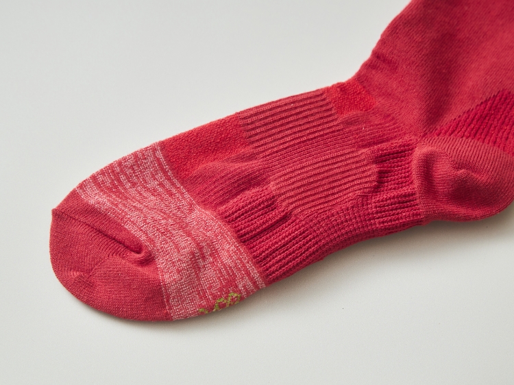 そして、足の力を効率よく伝えるのが「滑り止め編み」です。靴の中で足がわずかに泳いでしまう「ズレ」は、無意識のうちに指先に力を入れさせ、筋肉を疲弊させる隠れた原因になります。つま先手前の母指球部分にポリウレタンゴムの糸を編み込むことにより、靴の中で滑りにくくしています。