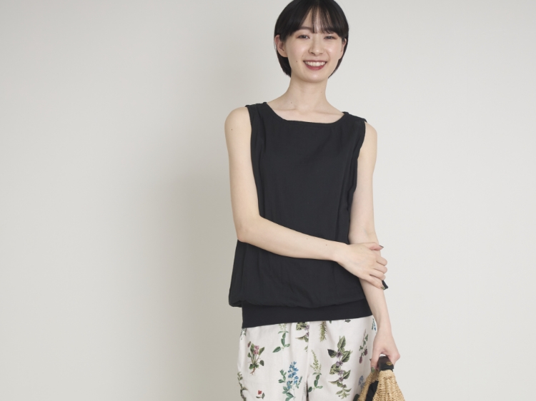 肩をしっかり覆うのでブラ紐が見えにくく、タンクトップには珍しいボートネックでデコルテがきれいに見え、かつ露出が気にならないデザインです。