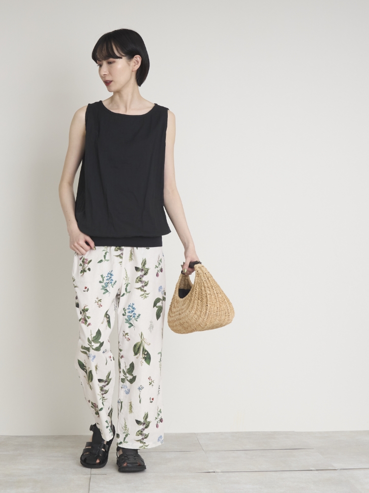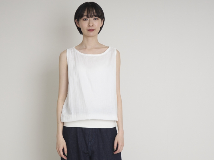 こちらは、甘く撚った糸でふんわり織りあげたダブルガーゼのタンクトップです。生地には洗いがかかっている為、着始めから優しい肌当たり。肌が敏感な方にも、安心して着ていただくことができます。