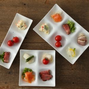 和洋中をはじめ、あらゆる料理に合うホワイトカラーも魅力のひとつ。三つに仕切られた部分(窪み)は少し深めになっているため、汁物などもキレイに盛り付けることができます。前菜や箸休めはもちろん、クッキーにナッツ類、薬味、ソースなど、ニーズに合わせて利用OK。食事、ティータイム、パーティーなどで大活躍してくれそうです。